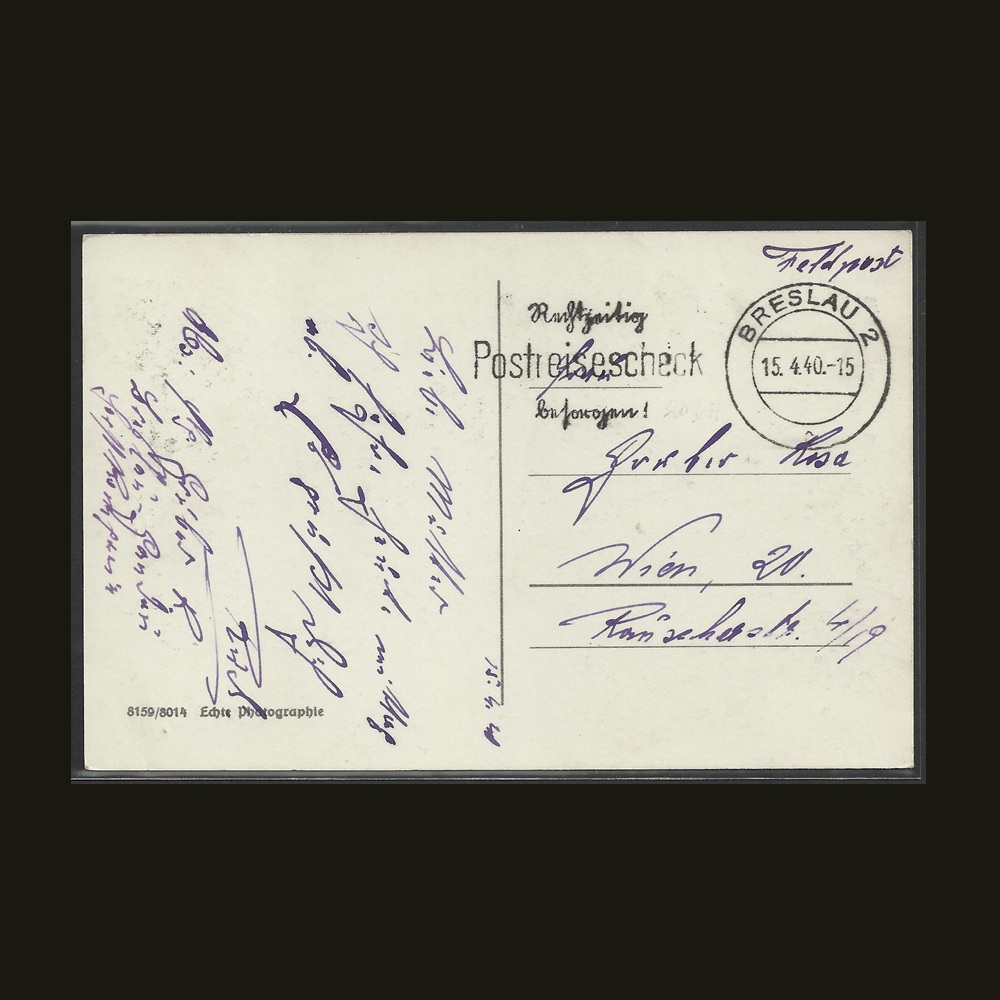Rodzaj: fotograficzna Stan: produkt kolekcjonerski (patrz skan) Data: 1940 Obieg: tak Znaczek: nie (feldpost) Oryginał: tak